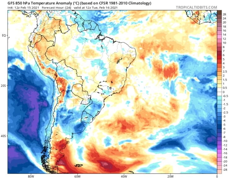 Anomalies thermiques sur le continent sud-américain ce mardi 16 février 2021 - via tropicaltidbits.com