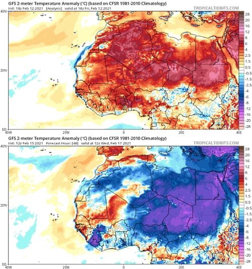Anomalies thermiques sur le nord de l'Afrique le 12 février et le 17 février 2021 - via tropicaltidbits.com