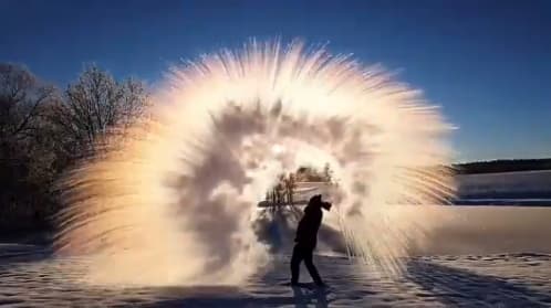 La photo ci-dessus montre l'effet Mpemba dans le Land de la Thuringe dans le centre de l'Allemagne. Il s'agit d'eau bouillante qui se change presque immédiatement en neige lorsque celle-ci est brutalement dispersée dans un air très froid. Ici, la température de -18°C permettait l'observation de ce phénomène physique très esthétique.