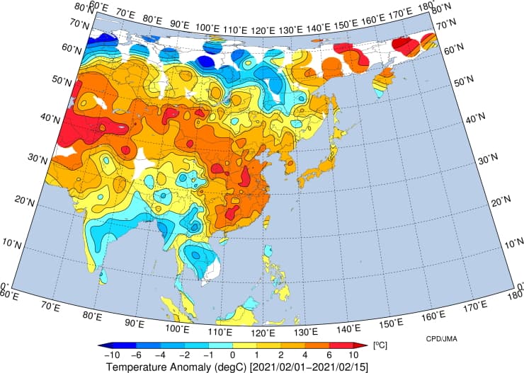 Anomalies thermiques en Asie en première quinzaine de février 2021 - via JMA