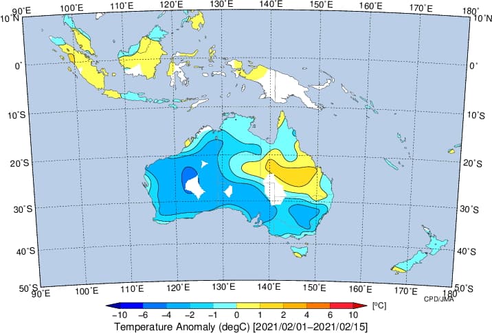 Anomalies thermiques en Océanie en première quinzaine de février 2021 - via JMA