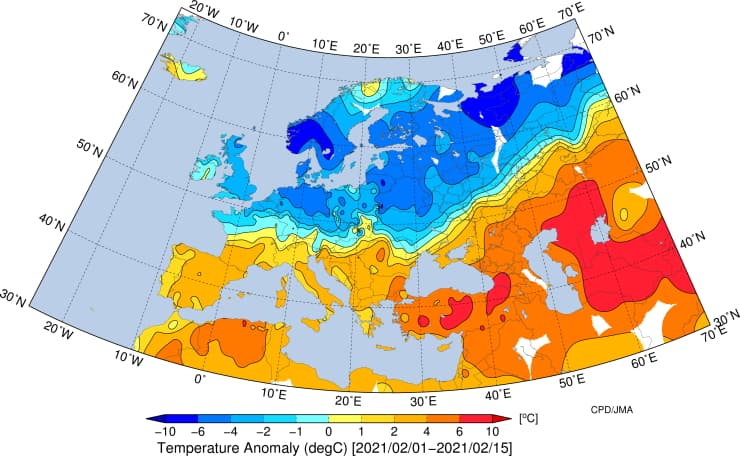 Anomalies thermiques en Europe en première quinzaine de février 2021 - via JMA