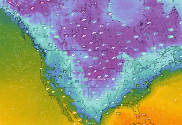 Températures relevées aux États-Unis en matinée du lundi 15 février 2021 - via windy.com