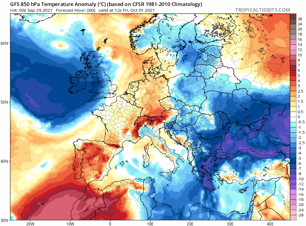 En regardant la modélisation des anomalies thermiques pour la fin de semaine, on observe les effets du flux de sud réchauffant considérablement la masse d'air ce week-end des 2 et 3 octobre 2021 sur le sud et l'est de la France, avant que l'air très frais venu de l'Atlantique-nord ne s'engouffre sur le pays et se généralise dès le lundi 4 octobre.