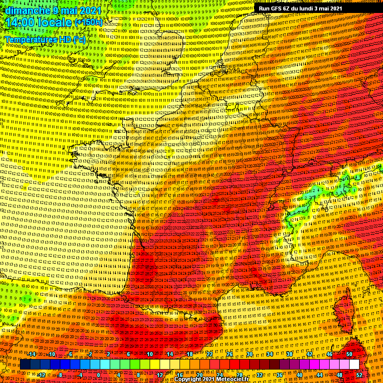 Températures maximales envisagées le dimanche 9 mai 2021 – Modèle GFS du lundi 3 mai 12h