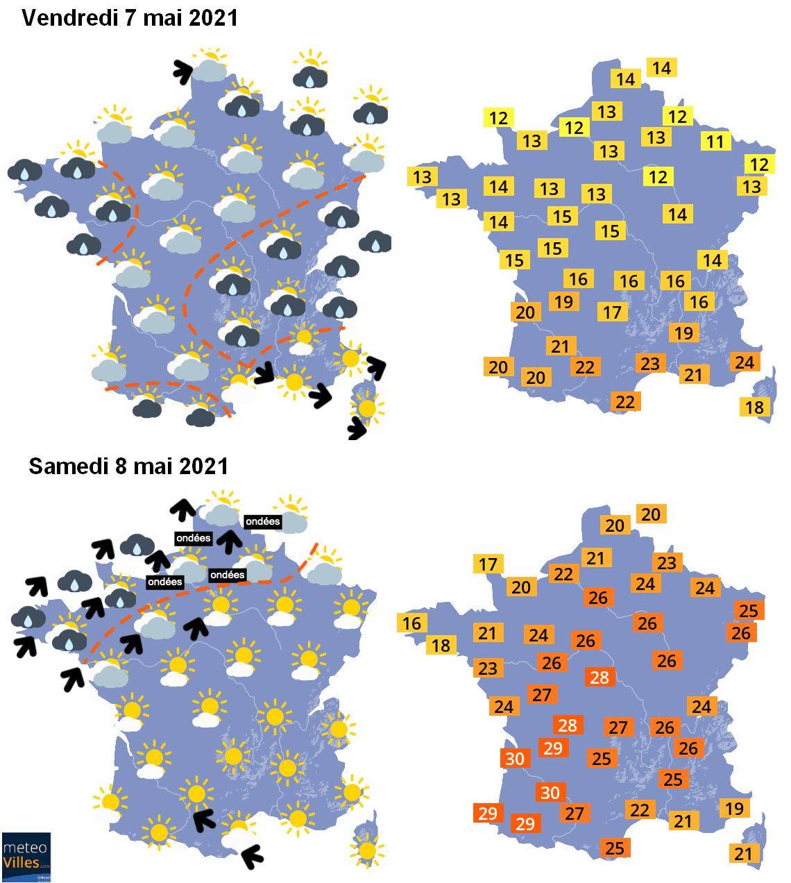 Evolution du temps et des températures maximales entre vendredi 7 et samedi 8 mai 2021 sur la France – Météo-Villes