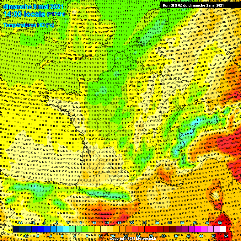 Températures maximales envisagées le dimanche 9 mai 2021 – Modèle GFS du dimanche 2 mai 12h