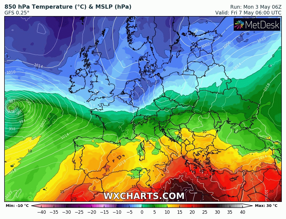 Animation des températures à 850 hPa  du vendredi 7 au lundi 10 mai sur l’Ouest de l’Europe – Modèle GFS via WX CHARTS