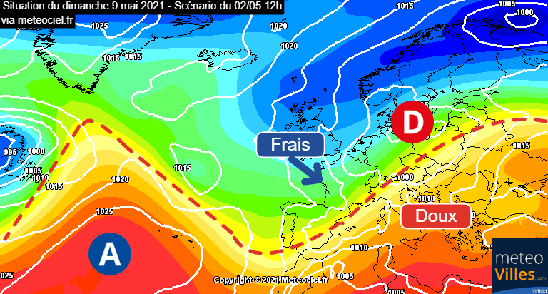 Situation atmosphérique du dimanche 9 mai 2021 – Modèle GFS du dimanche 2 mai 12h, modifié par Météo-Villes