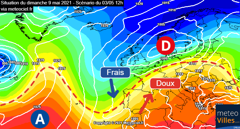 Situation atmopshérique du dimanche 9 mai 2021 – Modèle ECMWF, modifié par Météo-Villes