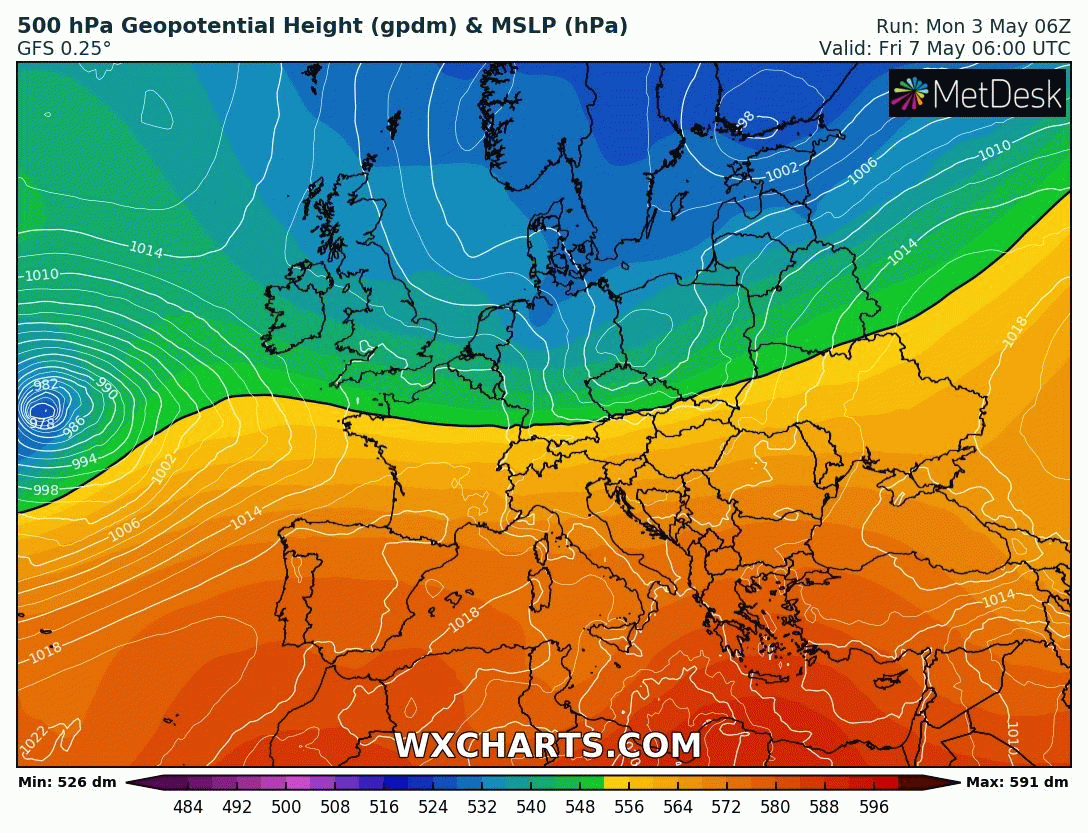 Animation des géopotentiels du vendredi 7 au lundi 10 mai sur l’Ouest de l’Europe – Modèle GFS via WX CHARTS