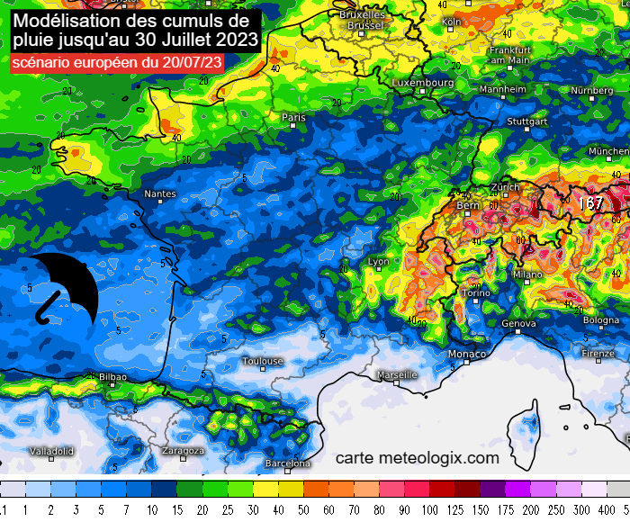 Cumuls de pluie envisagés par le modèle européen jusqu'au 30 juillet 2023 - via meteologix.com