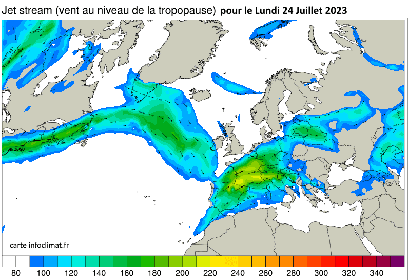 Circulation du jet stream prévue le lundi 24 juillet 2023 - via infoclimat.fr