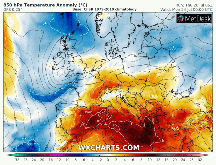 Écart à la moyenne de la température de la masse d'air du 24 au 30 juillet 2023 - via wxcharts.com