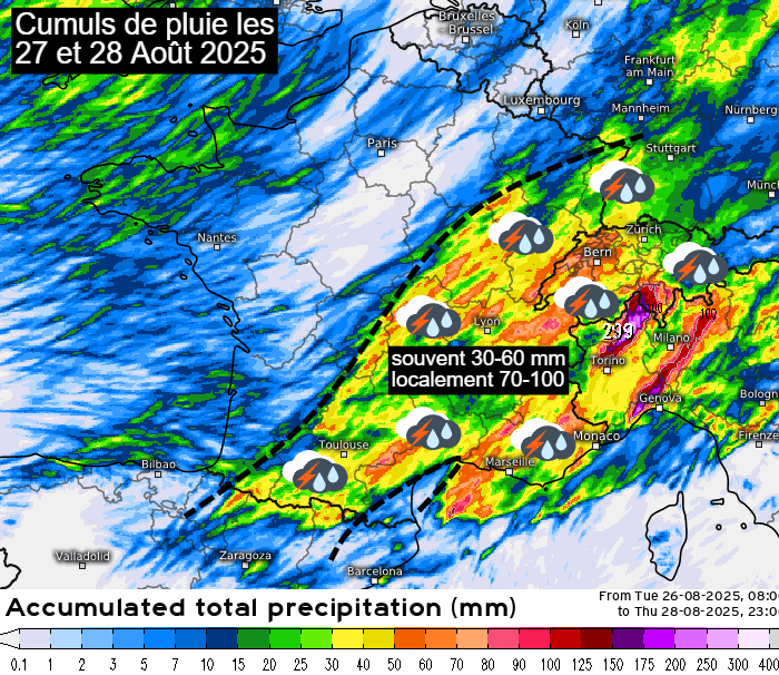 On redoute notamment d'importantes quantités de pluie dans le sud et l'est de la France, des Pyrénées aux frontières orientales et jusqu'en Méditerranée (le Roussillon semble moins exposé). Même si les cumuls seront évidemment hétérogènes car dépendant directement de la localisation des orages les plus forts, les modélisations envisagent fréquemment 30 à 60 mm sur les journées des mercredi 27 et jeudi 28 août 2025 avec des pointes locales entre 70 et 100 mm. Ces pluies vont faire du bien à la nature qui a souffert de la canicule mais elles pourraient - en tombant sur de courts laps de temps - conduire à des inondations locales.
