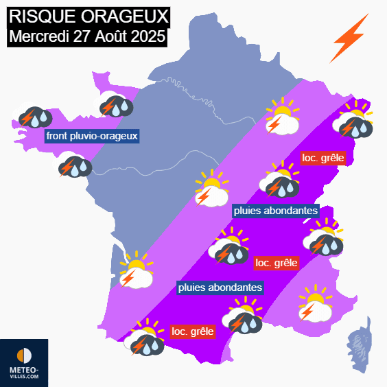 Carte du risque orageux pour le mercredi 27 août 2025 - Météo Villes