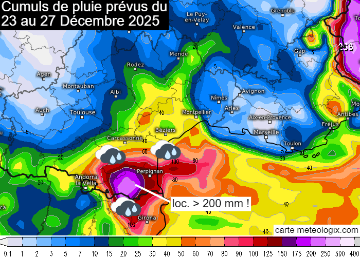 Ce mardi 23 décembre 2025 marque une accalmie pour les régions cévenoles, où les précipitations faiblissent nettement et vont même totalement cesser en soirée. Avec un flux qui vire désormais au secteur est, les précipitations copieuses vont se décaler vers l'Aude et les Pyrénées-Orientales où il pleuvait déjà fortement ce matin. Si une accalmie se produira mercredi, des pluies soutenues feront leur retour entre le jour de Noël et le samedi 27 décembre 2025. Il pourra tomber entre 100 et 200 mm dans ces deux départements ! Certains secteurs envisagent des pointes à plus de 200 mm.
