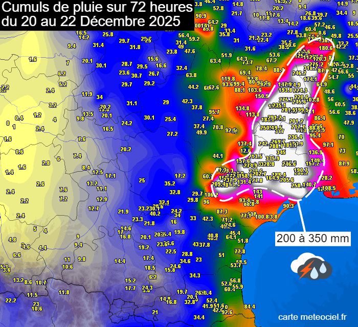 Entre ce week-end des 20 et 21 décembre et la journée du lundi 22 décembre 2025, les précipitations ont été très abondantes sur le Languedoc et les Cévennes. En l'espace de 72 heures, il est tombé généralement entre 200 et 350 mm sur le massif cévenol ! On relève jusqu'à 345 mm à Gorniès et 336 mm à Saint-Maurice-Navacelle dans l'Hérault. La plaine n'a pas été épargnée, loin de là. La station de Montpellier totalise 141 mm et on relève même 258 mm à Saint-Jean-de-Védas !