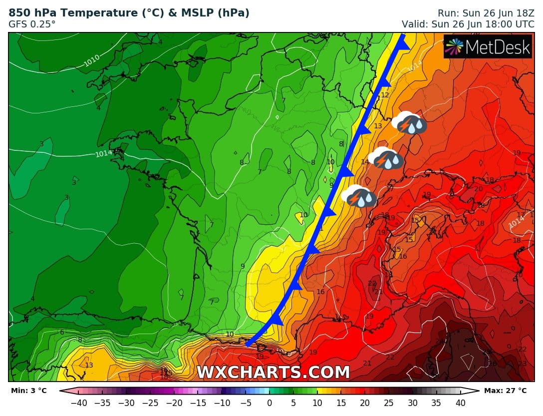 Masses d'air à 850 hPa (vers 1500m) en soirée du dimanche 26 juin 2022 - via wxcharts.com