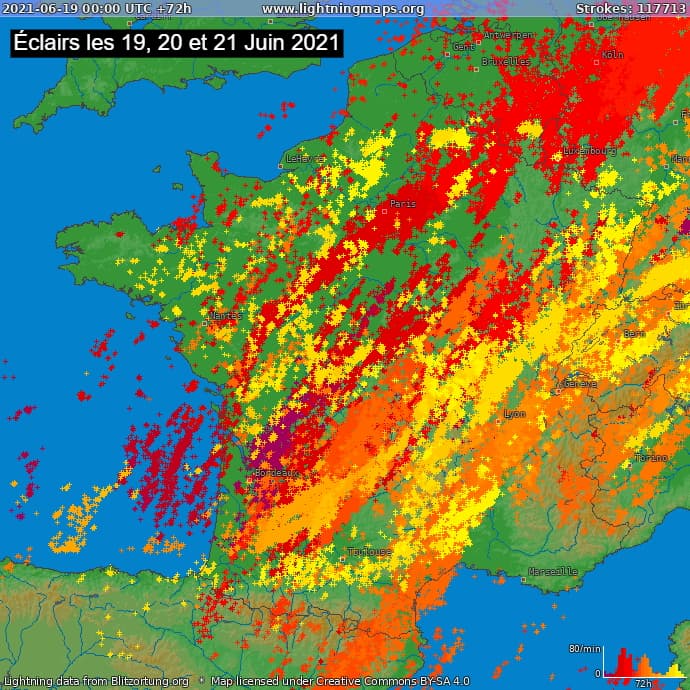 Éclairs détectés durant les samedi 19, dimanche 20 et lundi 21 juin 2021 - via www.lightningmaps.org