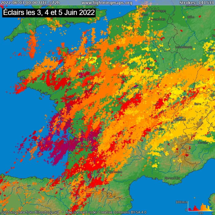 Éclairs détectés durant les vendredi 3, samedi 4 et dimanche 5 juin 2022 - via www.lightningmaps.org