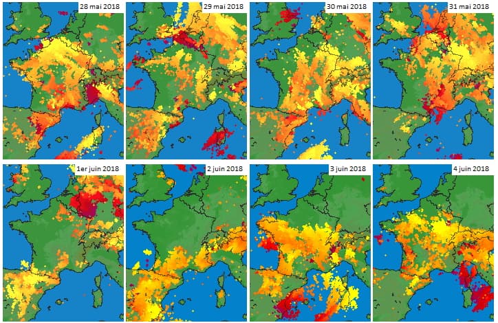 Par le passé, la France a déjà connu des périodes remarquablement orageuses. Au cours des dernières années, la plus marquante s'est probablement déroulée entre le 20 mai et le 11 juin 2018. À l'époque, une situation hautement orageuse perdure sur la France durant plus de 20 jours ! De manière quasi-quotidienne, de forts orages s'enchaînent sur le pays pendant trois longues semaines sans épargner aucune région. Rien qu'en mai 2018, on dénombrera 182.000 impacts de foudre en France, 3 fois plus que la normale !