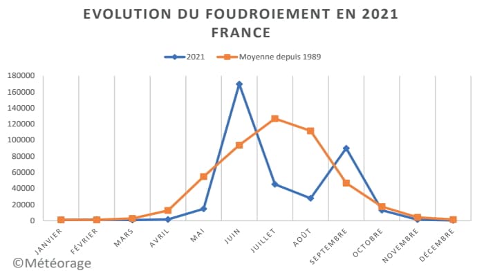 Le graphique ci-dessus montre une forte irrégularité de foudroiement d'une année sur l'autre (de 725.000 impacts en 2018 à seulement 282.000 en 2019) mais ces irrégularités se rencontrent aussi entre les mois d'une même année. Par exemple, l'année 2021 a enregistré 367.000 impacts de foudre en France - la positionnant dans le top 10 des années les moins foudroyées depuis plus de 30 ans - mais cela n'a pas empêché juin 2021 d'être exceptionnellement orageux avec 172.000 impacts, une valeur inédite en juin depuis 1993 et représentant 46% du total annuel de foudroiement ! Septembre 2021 fut également très orageux tandis que mai, juillet et août furent étonnamment pauvres en orages.