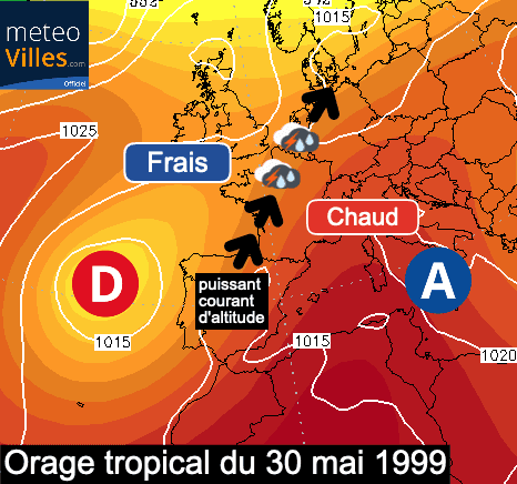 A peu prêt à la même période, le 30 mai 1999, une situation similaire à celle que nous connaissons ce 4 juin 2021 se met en place sur la France, à savoir une zone dépressionnaire s’avançant sur la France par l’Atlantique et apportant de l'air frais et humide en altitude sur des températures encore élevées près du sol.