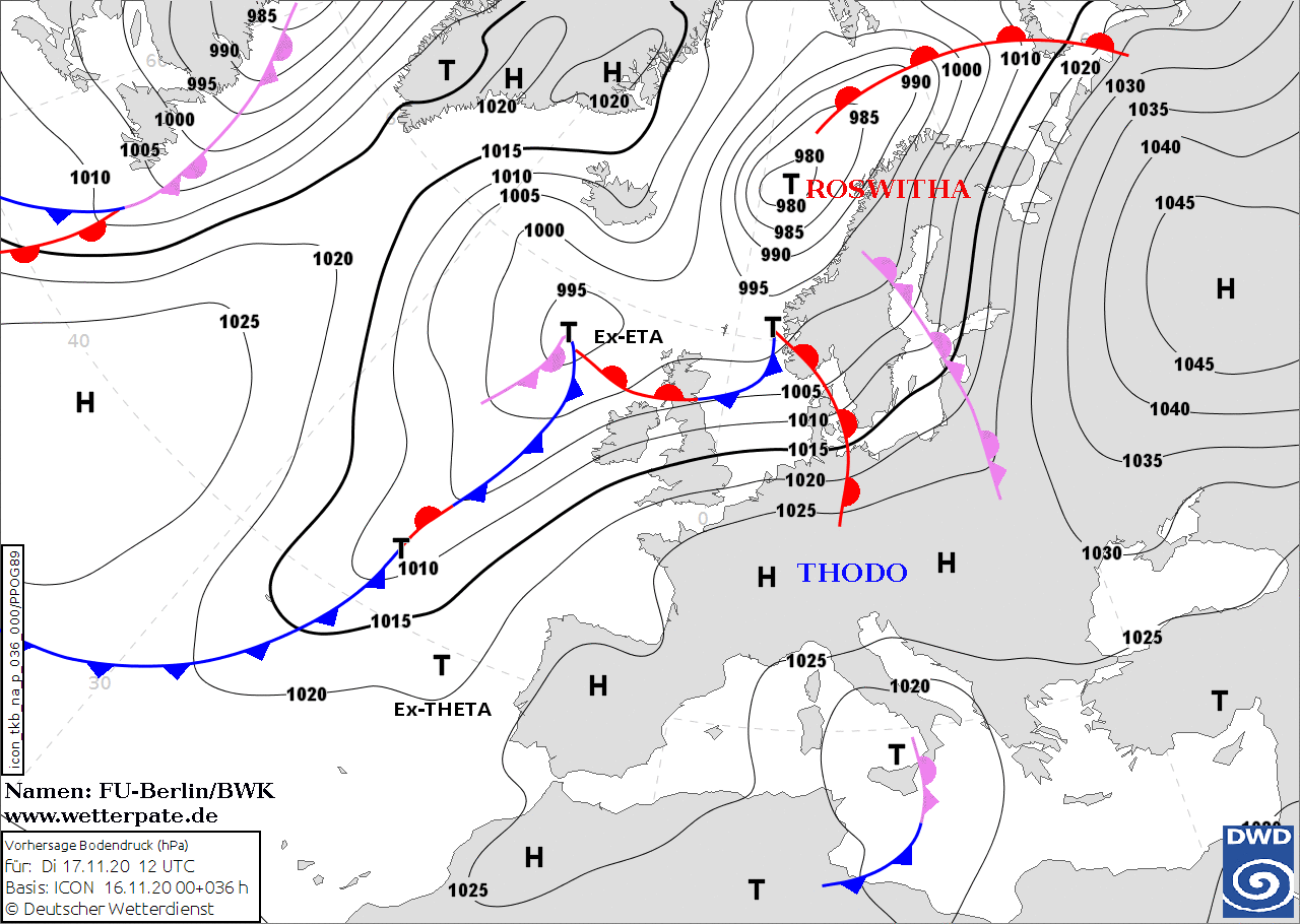 Noms des dépressions et anticyclones prévus pour mardi 17 novembre 2020 à midi (Berlin)