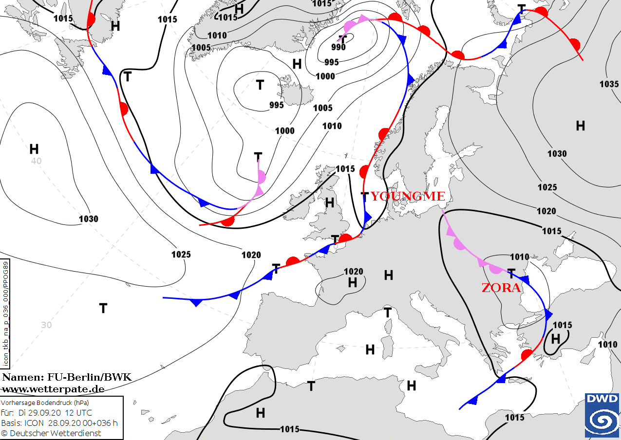 Noms des dépressions et anticyclones prévus pour mardi 29 septembre 2020 à midi (Berlin)