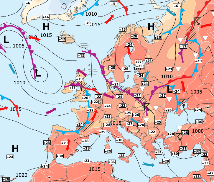 + La météo ne redeviendra durablement stable et estivale lorsque le centre de l'anticyclone des Açores s'étendra vers Allemagne, c'est-à-dire pas avant la 2eme quinzaine de juillet.