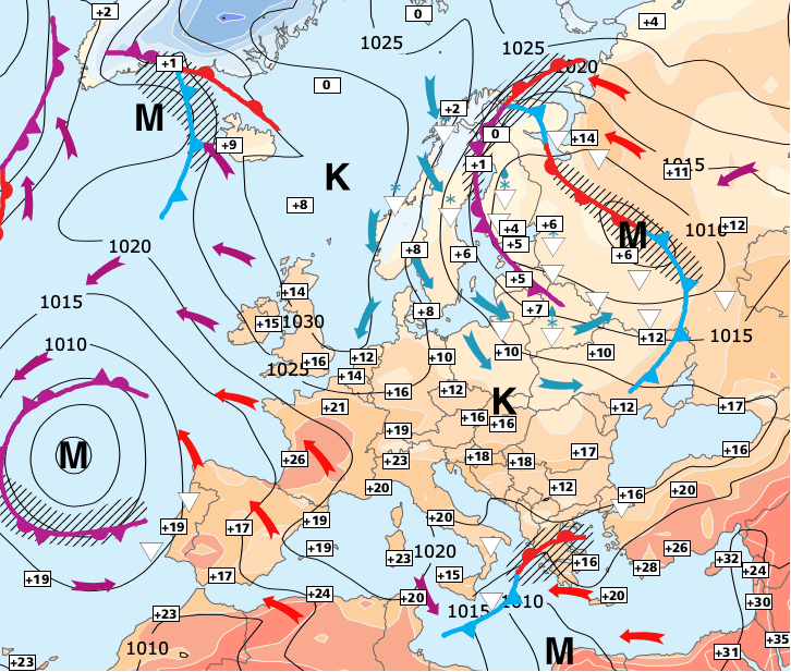 + La France reste largement influencée par un vaste anticyclone centré en mer du Nord, qui maintient un temps sec et ensoleillé sur tout le pays.