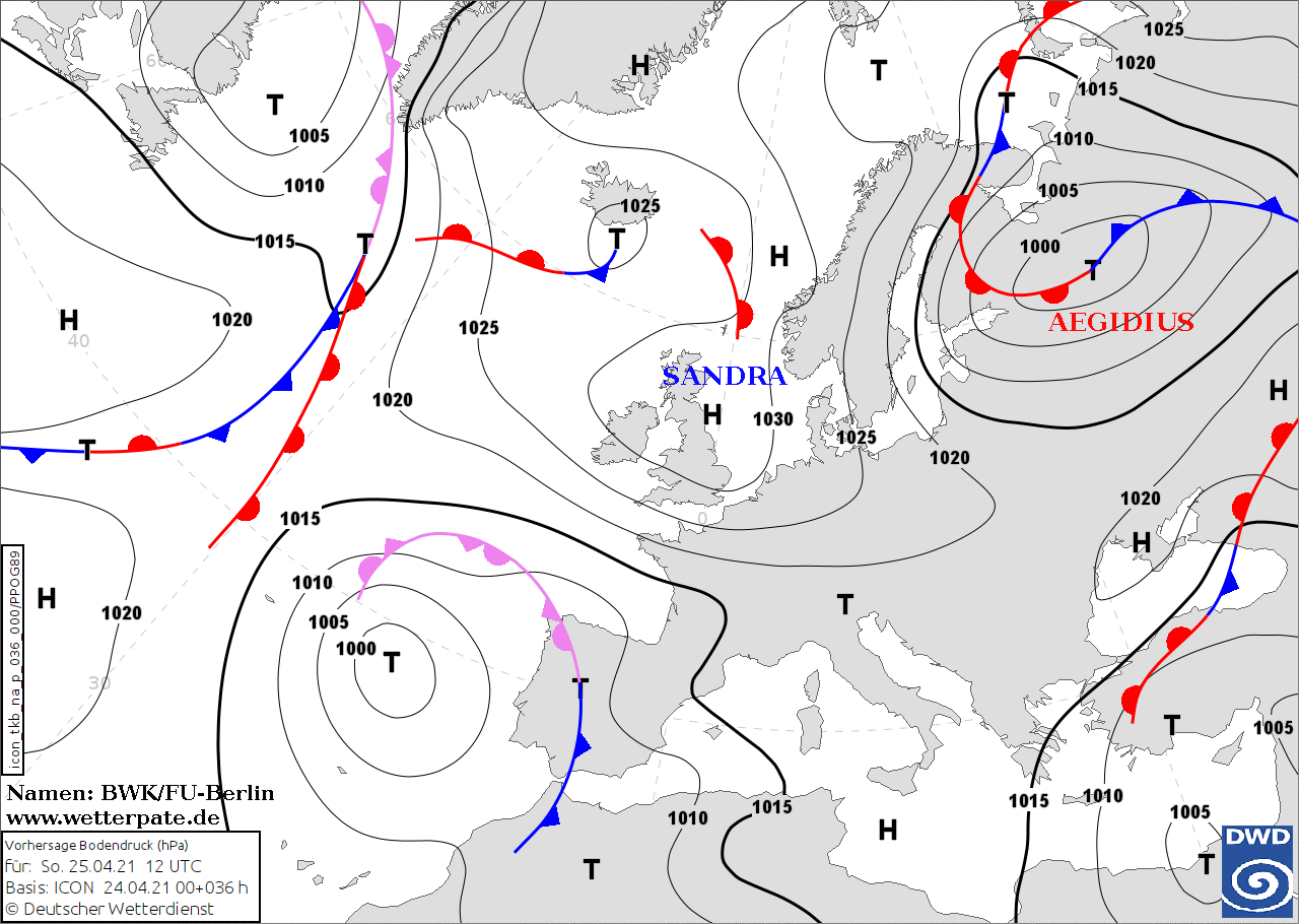 Noms des dépressions et anticyclones prévus pour dimanche 25 avril 2021 à midi (Berlin)