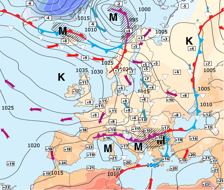 Noms des dépressions et anticyclones prévus pour dimanche 4 avril 2021 à midi (Berlin)