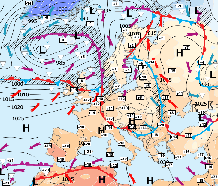 + Le centre de l’anticyclone se décale vers l’Europe centrale, ce qui va permettre une remontée d'air de plus en plus chaud d'Afrique du Nord.