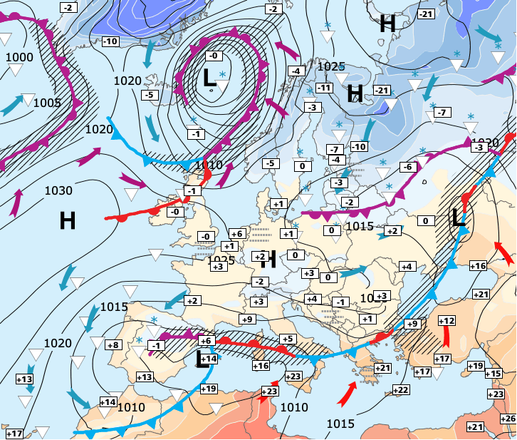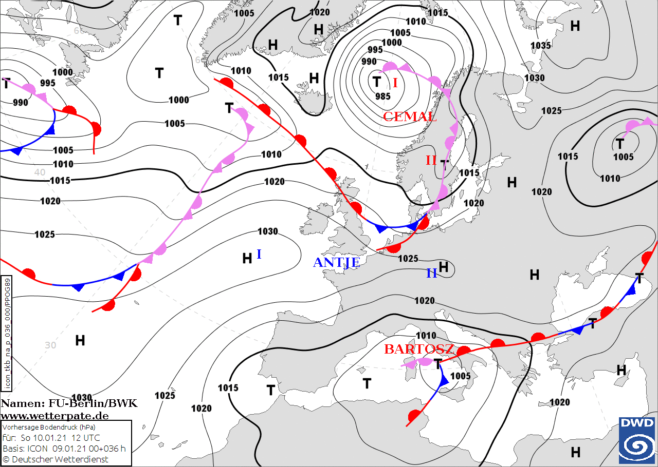 Noms des dépressions et anticyclones prévus pour dimanche 10 janvier 2021 à midi (Berlin)