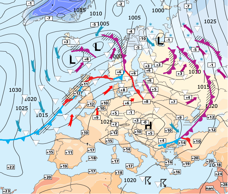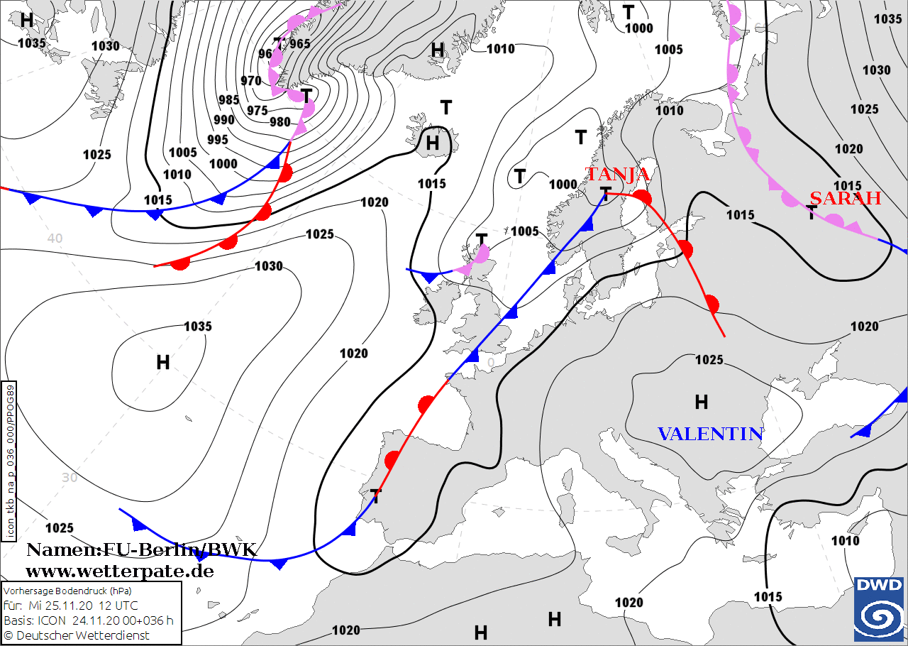 Noms des dépressions et anticyclones prévus pour mercredi 25 novembre 2020 à midi (Berlin)