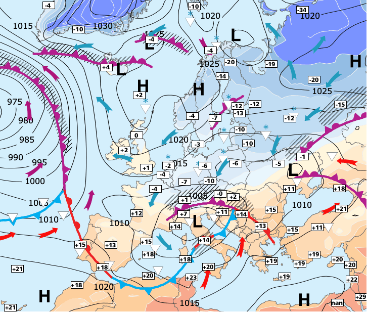 + Les hautes pressions se décaleront lentement vers l’Allemagne à partir de dimanche et le courant s’orientera au sud-est (air légèrement moins froid).