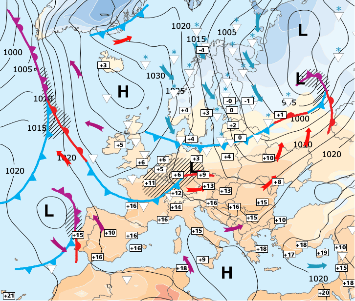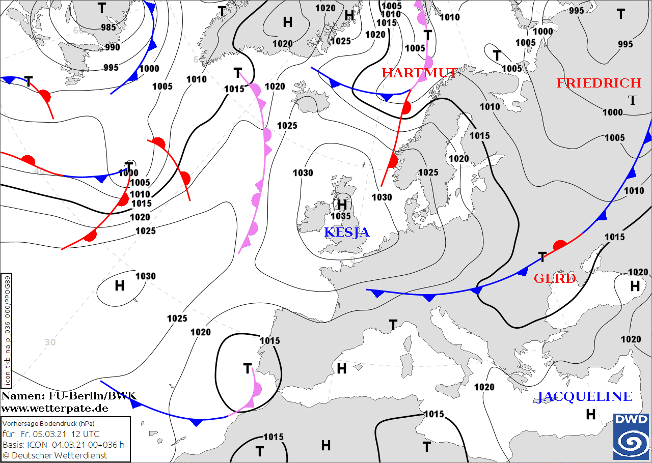 Noms des dépressions et anticyclones prévus pour vendredi 5 mars 2021 à midi (Berlin)