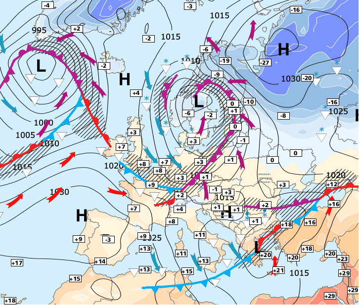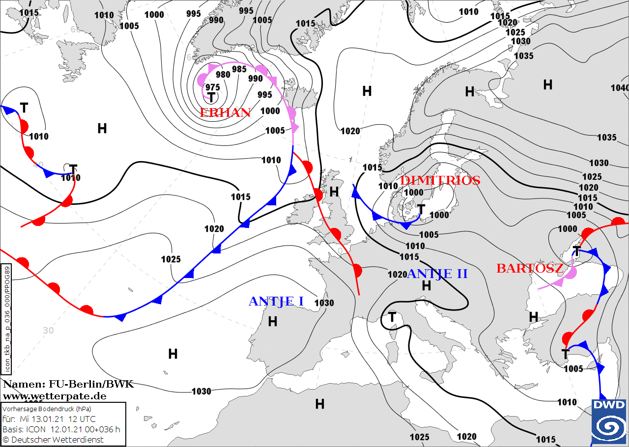 Noms des dépressions et anticyclones prévus pour mercredi 13 janvier 2021 à midi (Berlin)