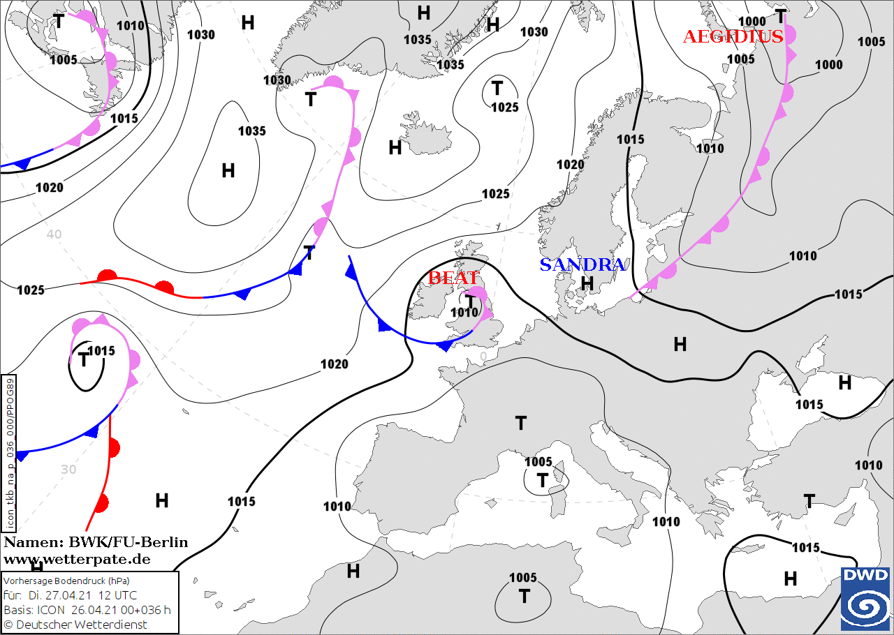 Noms des dépressions et anticyclones prévus pour mardi 27 avril 2021 à midi (Berlin)