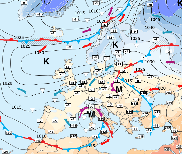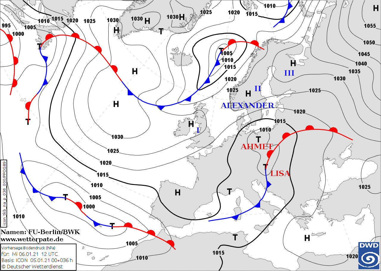 Noms des dépressions et anticyclones prévus pour mercredi 6 janvier 2021 à midi (Berlin)