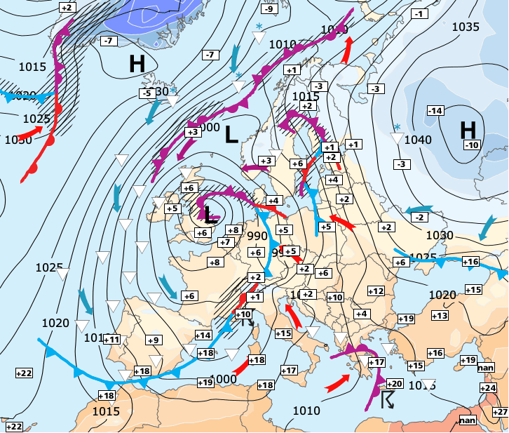 + La profonde dépression Wenke à l'origine de ces abondantes chutes de neige en montagne (et localement sur les hauteurs bretonnes et normandes) se décalera vers le Cotentin dans la journée de samedi.