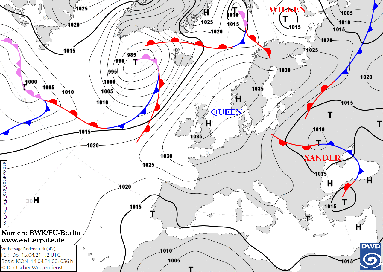 Noms des dépressions et anticyclones prévus pour jeudi 15 avril 2021 à midi (Berlin)