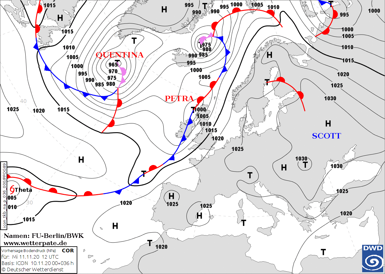 Noms des dépressions et anticyclones prévus pour mercredi 11 novembre 2020 à midi (Berlin)