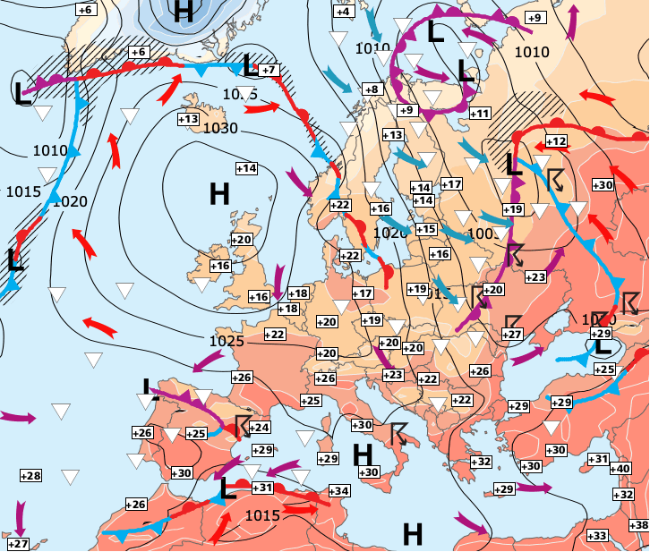 + Depuis ce moment là, quasiment tous les scénarios envisagent une minuscule goutte froide d'altitude restant positionnée sur le proche Atlantique (et véhiculant au contraire de l’air très chaud en provenance d’Afrique du Nord !).
