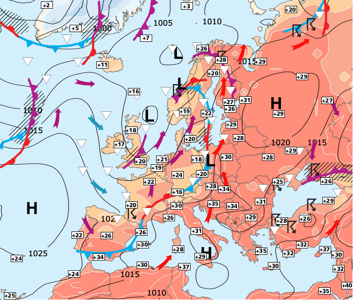 + Même s'il est faible, le courant océanique reste dominant sur l’Europe occidentale, et le temps reste assez mitigé pour la saison (sauf près de la Méditerranée où l'ambiance est beaucoup plus estivale).
