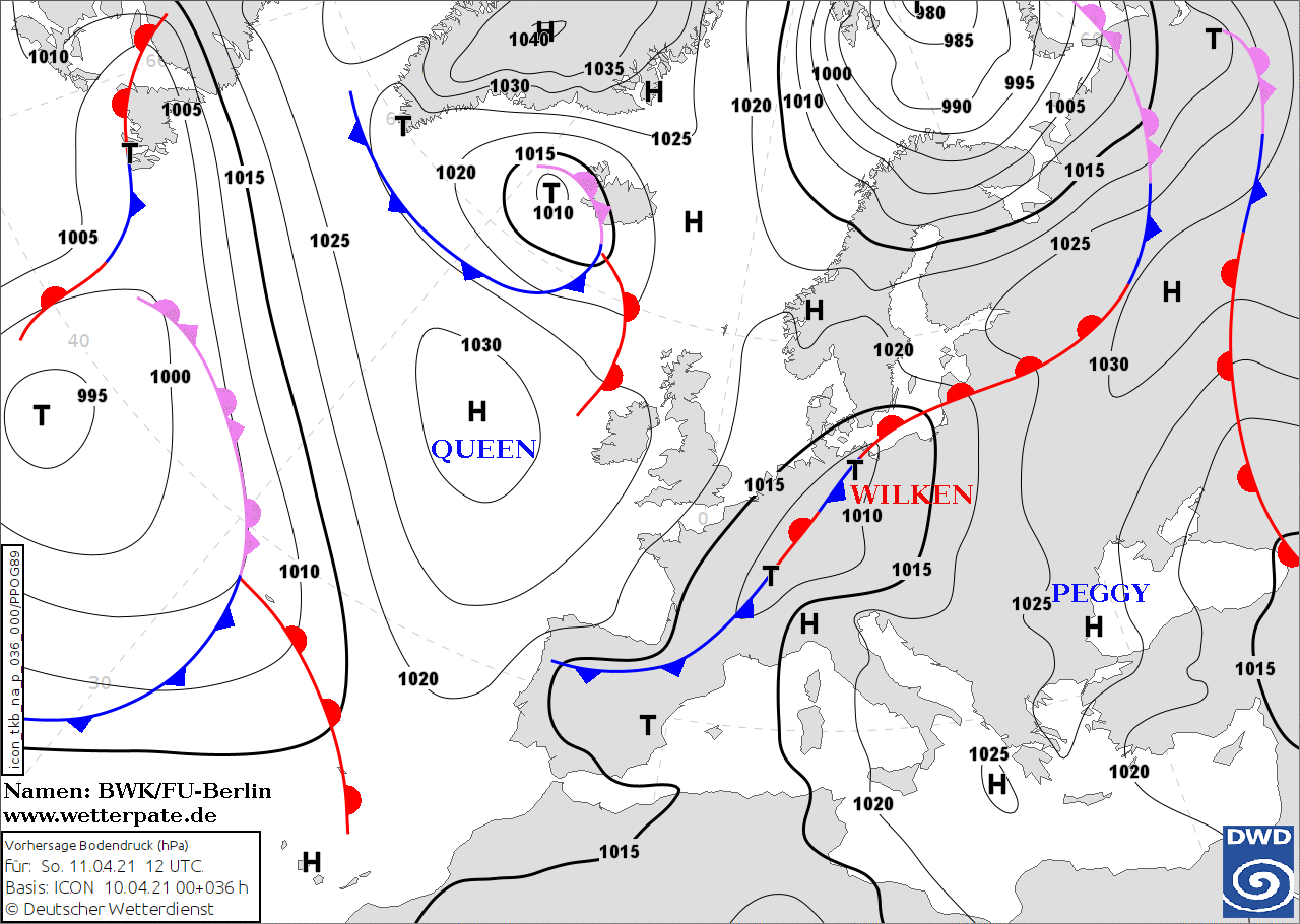 Noms des dépressions et anticyclones prévus pour dimanche 11 avril 2021 à midi (Berlin)