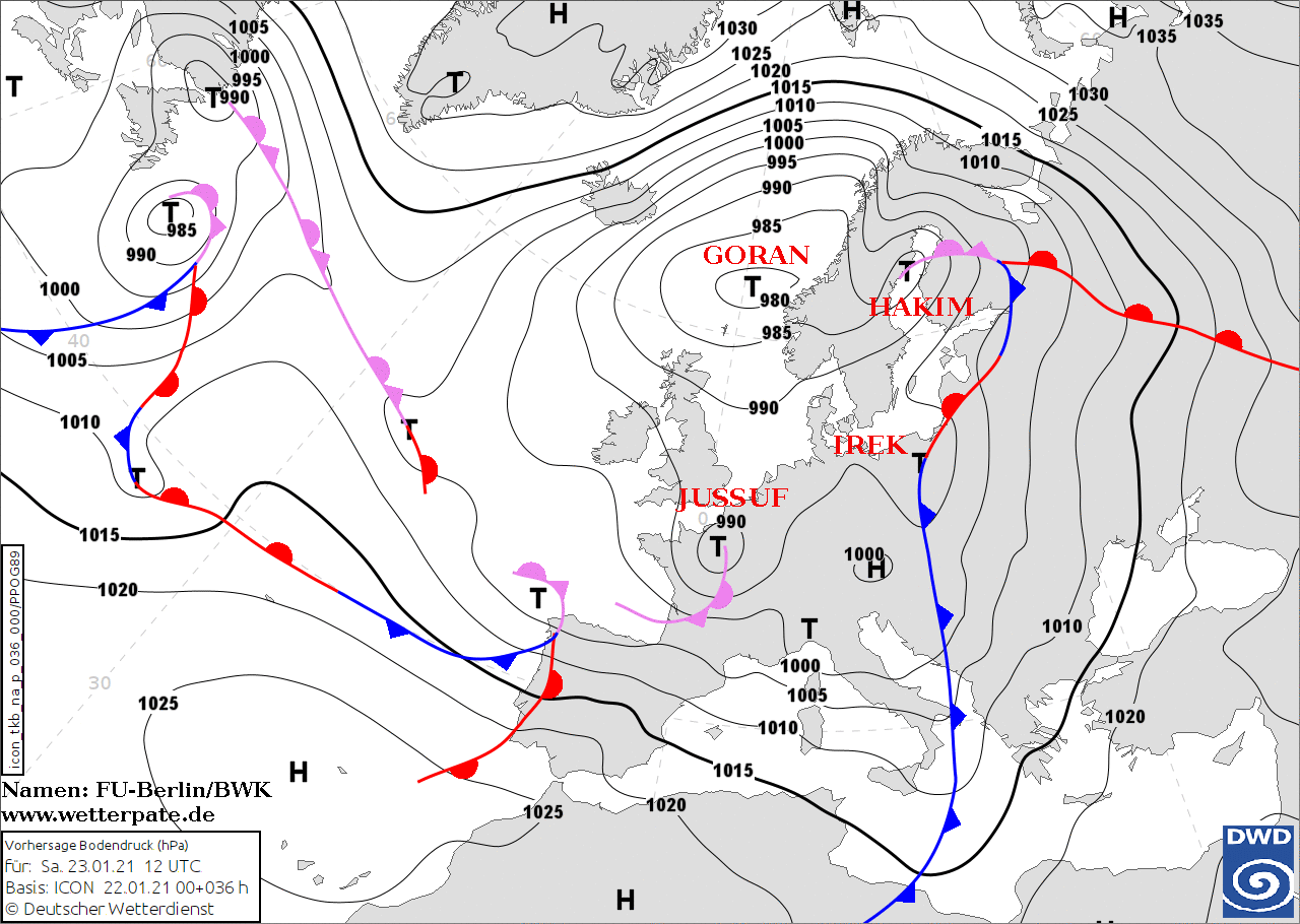 Noms des dépressions et anticyclones prévus pour samedi 23 janvier 2021 à midi (Berlin)