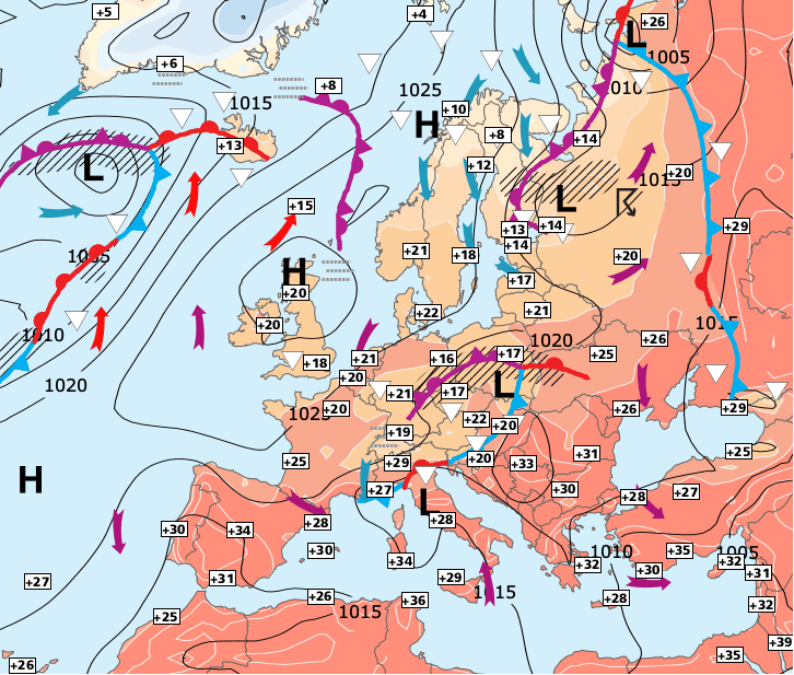 + Les températures seront assez élevées dans le Sud-ouest (plutôt influencé par l’air chaud circulant entre l’Afrique du Nord et l’Espagne), alors qu'il fera plus frais sur les régions du Nord et du Nord-est (air venu tout droit de Russie, Scandinavie et Pologne).